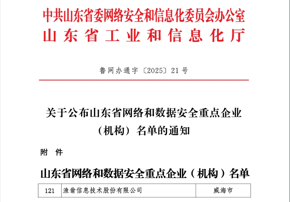 近期,山东省委网信办、山东省工信厅正式公布 山东省网络和数据安全重点企业(组织)名
